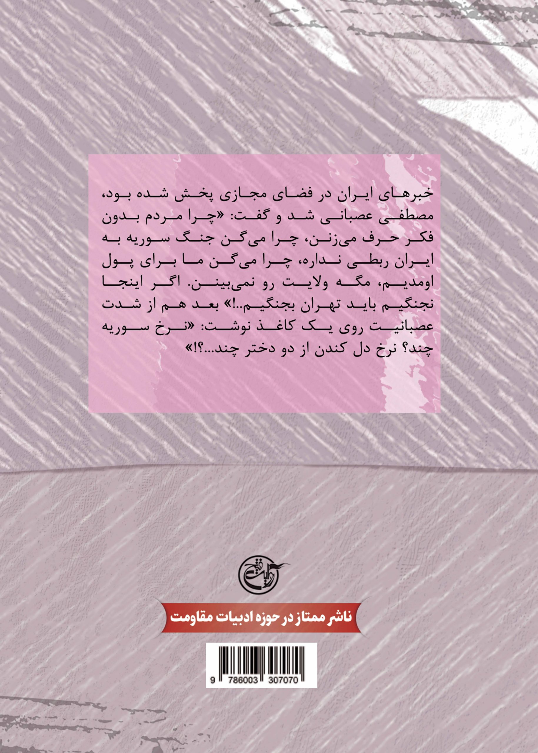خبرهای ایران در فضای مجازی پخش شده بود. مصطفی عصبانی شد و گفت:« چرا مردم بدون فکر حرف میزنن، چرا میگن جنگ سوریه به ایران ربطی نداره، چرا میگن ما برای پول اومدیم؟ مگه ولایت رو نمی بینن. اگر اینجا نجنگیم باید تهران بجنگیم..! بعد هم از شدت عصبانیت روی یک کاغذ نوشت:« نرخ سوریه چند؟ نرخ دل کندن از دو دختر چند…؟!»
