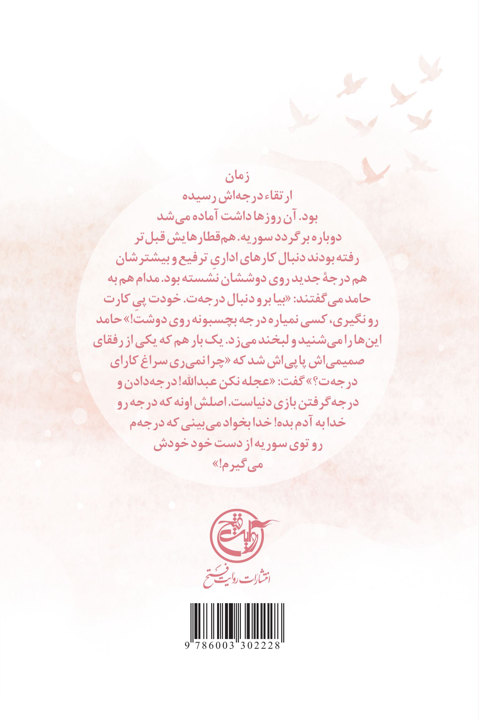 زمان ارتقای درجهاش رسیده بود. آن روزها داشت آماده میشد دوباره برگردد سوریه. هم قطارهایش قبلتر رفته بودند دنبال کارهای اداری ترفیع و بیشترشان هم درجۀ جدید روی دوششان نشسته بود. مدام هم به حامد میگفتند: «بیا برو دنبال درجهات. خودت پی کارت را نگیری، کسی نمیآورد درجه بچسباند روی دوشت!» حامد اینها را میشنید و لبخند میزد. یک بار هم که یکی از رفقای صمیمیاش پا پیاش شد: «چرا نمیروی سراغ کارهای درجهات؟» گفت: « عجله نکن عبدالله! درجه دادن و درجه گرفتن بازی دنیاست. اصلش آن است که درجه را خدا به آدم بدهد! خدا بخواهد میبینی که درجه را توی سوریه از دست خود خودش میگیرم!»