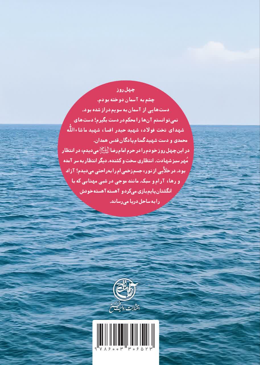 در این چهل روز خودم را در حرم امام رضا علیه السلام میدیدم. در انتظار مهر سبز شهادت. انتظاری سخت و کشنده. دیگر انتظار به سر آمده بود. در خلایی از نور جسم زخمیام را به راحتی میدیدم.ازاد و رها آرام و سبک. مانند موجی در شبی مهتابی که با انگشتان پایم بازی میکردو آهسته آهسته خودش را به ساحل دریا میرساند.