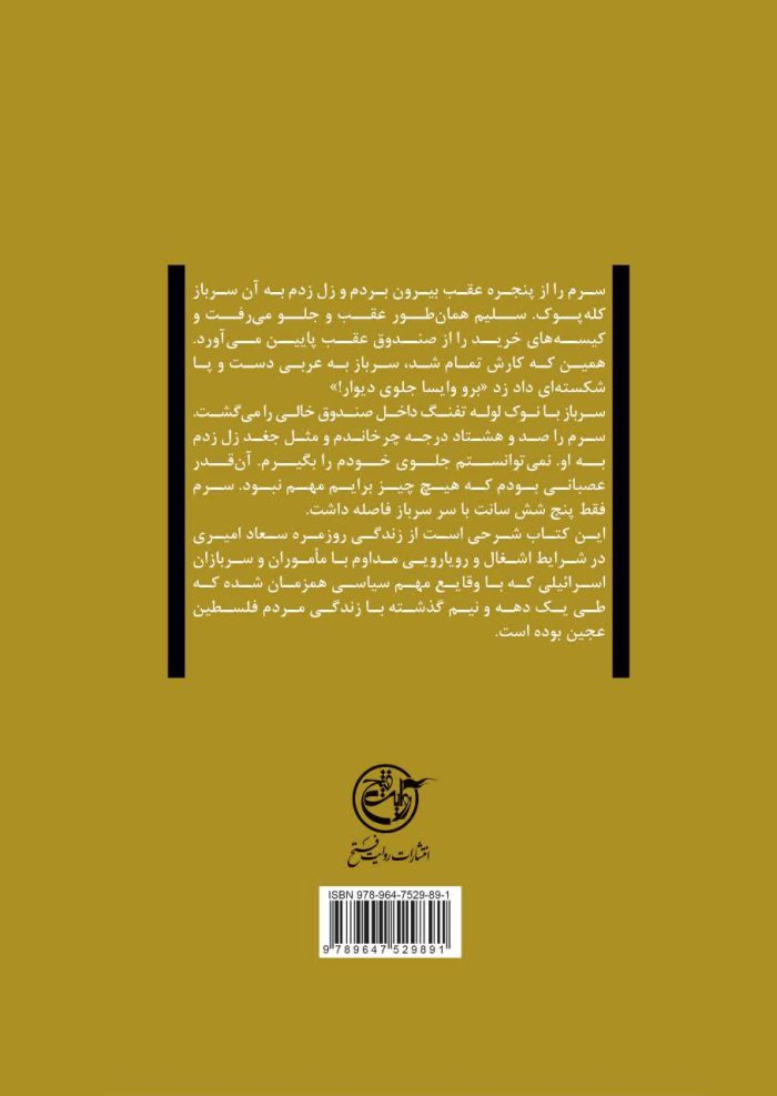 سرم را از پنجره بیرون بردم و زل زدم به آن سرباز کله پوک. سلیم همان‌طور عقب و جلو می‌رفت و کیسه‌های خرید را از صندوق عقب پایین می‌آورد. همین که کارش تمام شد، سرباز به عربی دست و پا شکسته‌ای داد زد« برو وایسا جلو دیوار»