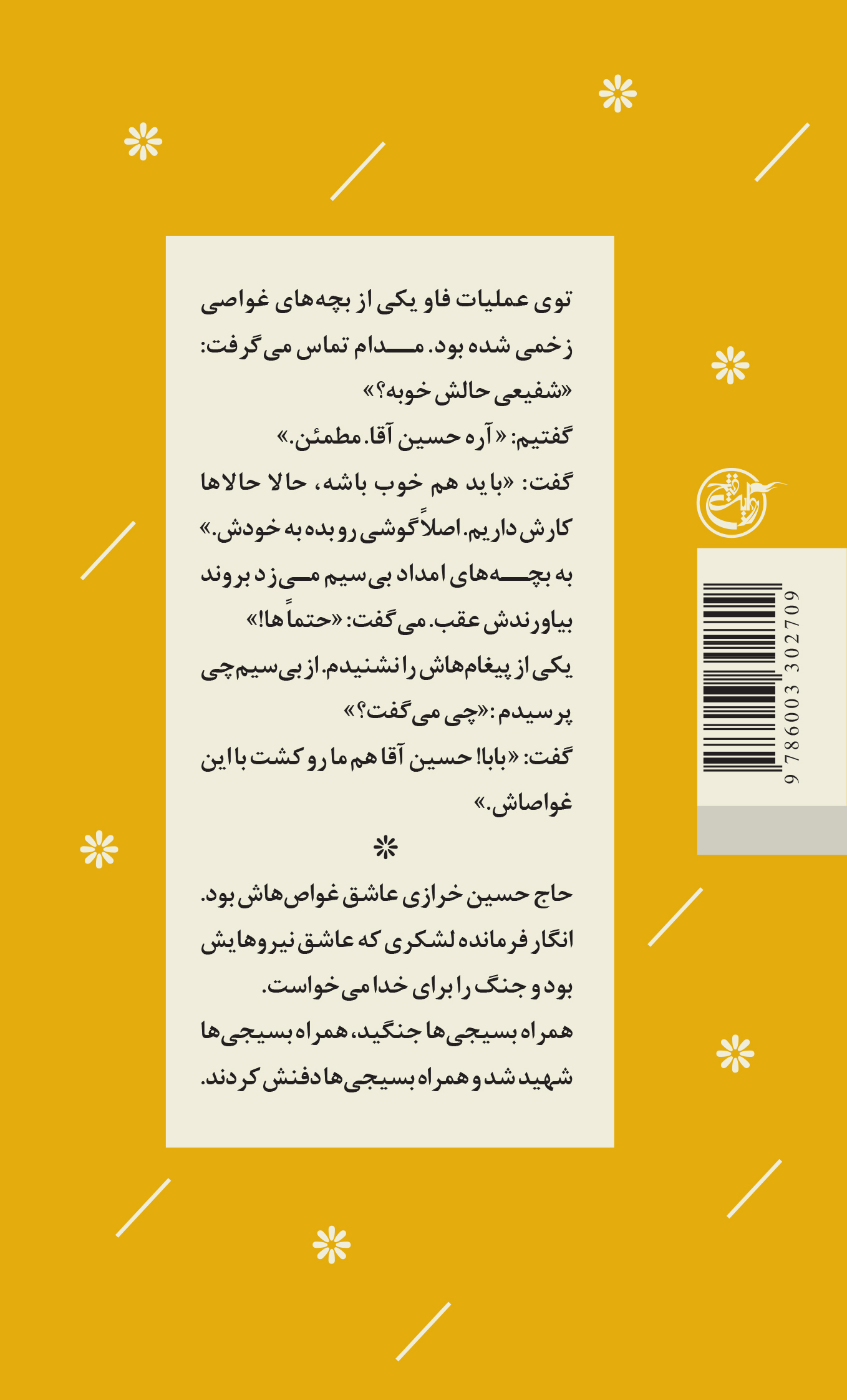 رفته بود کردستان. یازده ماه طول کشید. نه خبری، نه هیچی.هی خبر میآوردند توی کردستان، چندتا پاسدار را سربریدهاند. رادیو میگفت یازده نفر را زنده دفن کردهاند.مادرش میگفت «نکنه یکیشون حسین باشه؟ » دیگر داشت مریض میشد که حسین خودش آمد. با سر و وضع به هم ریخته و یک ساک پر از لباسهای خونی.